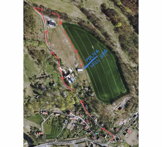 W miejscowości Wleń, należy kierować się na ul. Polną. Następnie trzeba podjechać pod górę, kierując się na pensjonat Polna Zdrój.